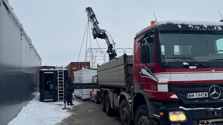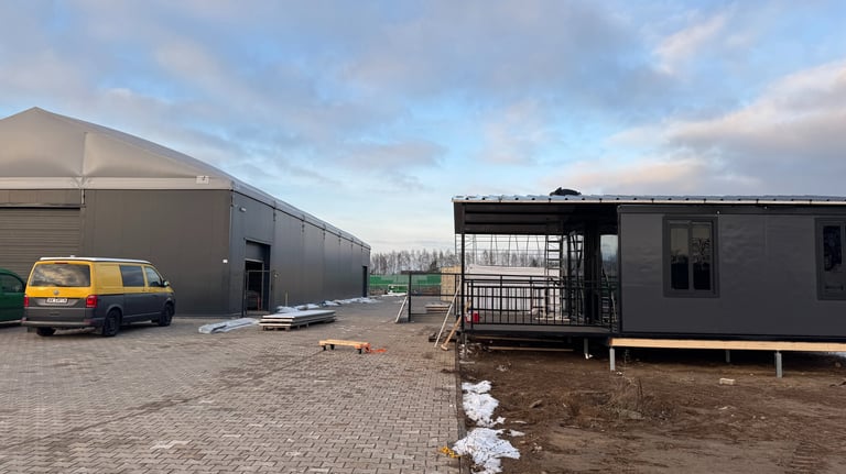 Podczas gdy moduły powstają w kontrolowanych warunkach fabrycznych, prace na działce postępują równolegle. Komponenty z całego świata – dom z Chin, opcjonalne okna z Niemiec, wentylacja z Japonii i drzwi z Polski – są precyzyjnie montowane w naszym zakładzie. Certyfikacje EU.